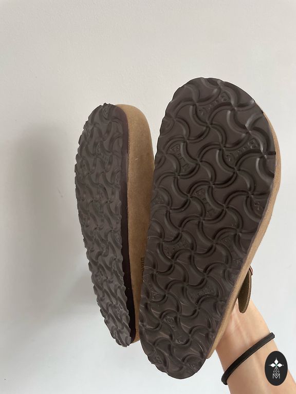 Lietotas Birkenstock sandales iešļūcenes ar dabīgā korķa zoli un dabīga zamša iekšpēdiņu, eco ādas Birko Floor pasteļa brūnas krāsas virspuse. Ir nēsātas, bet visnotaļ labā un svaigā kārtībā un viss ir vesels.