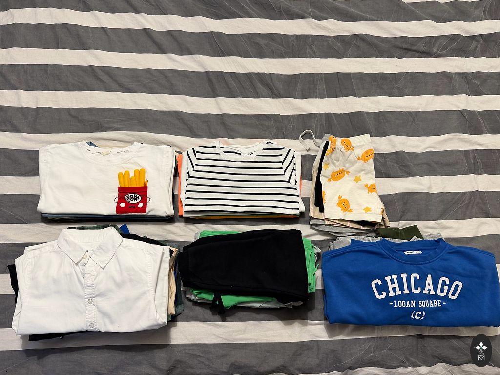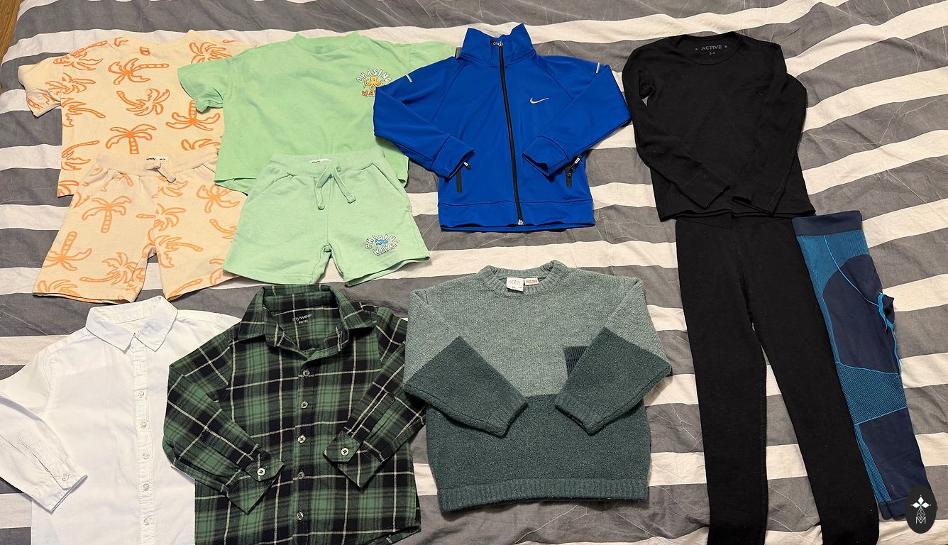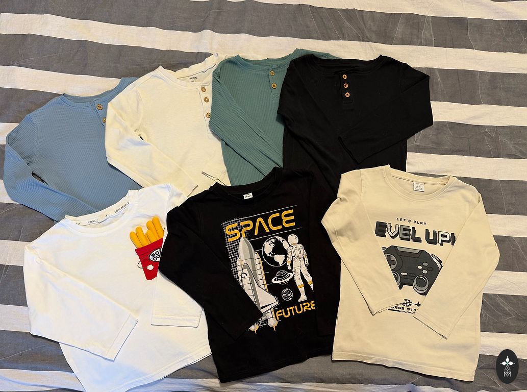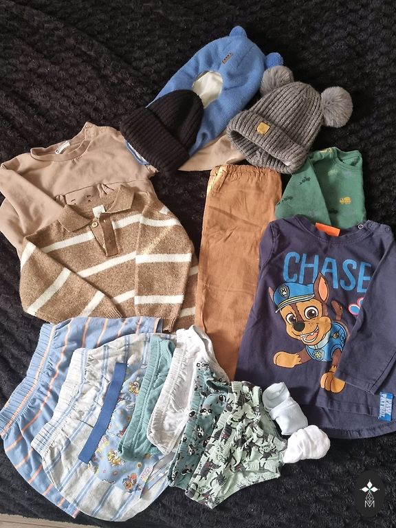 Įvairių prekės ženklų marškinėliai, ilgomis rankovėmis marškiniai, užtrauktuku striukės ir megztiniai. Kaina už komplektą.