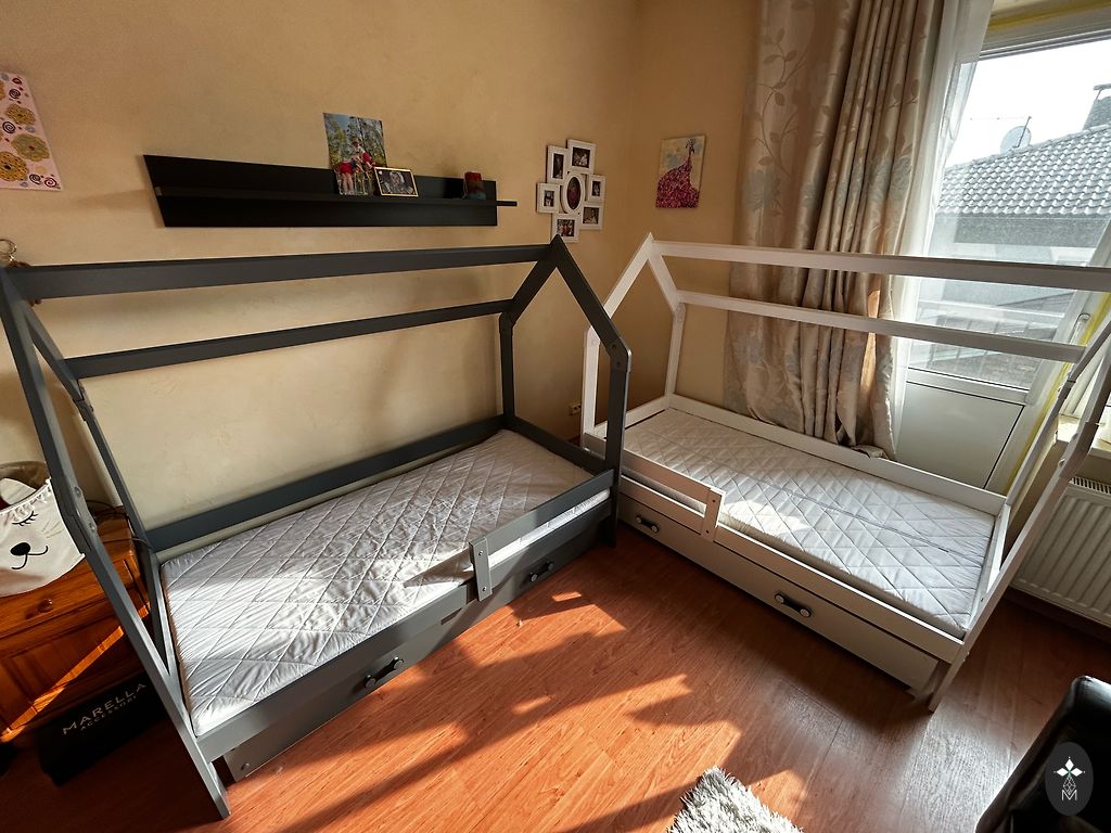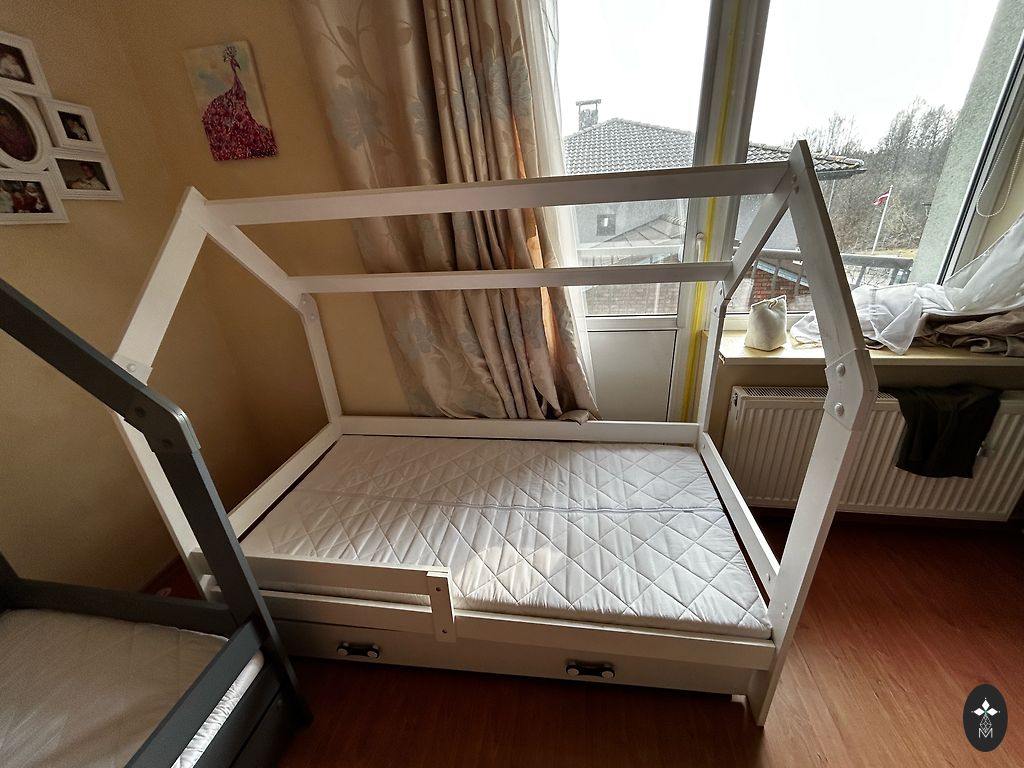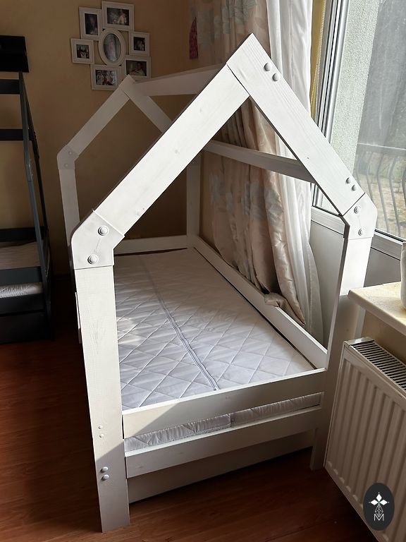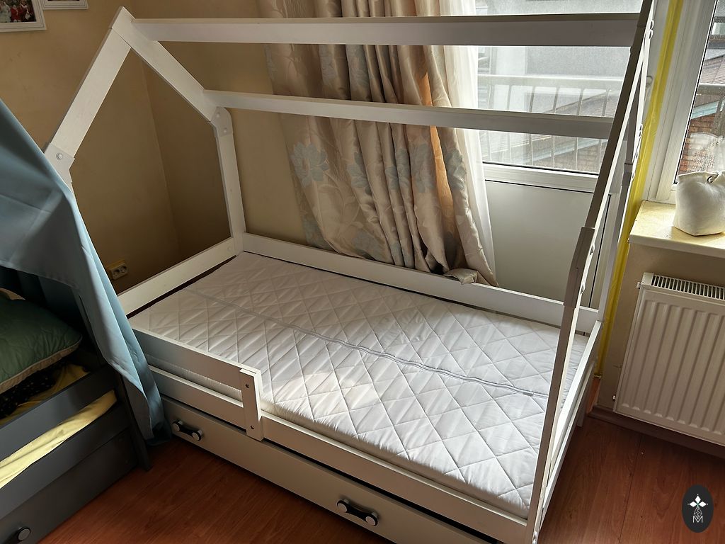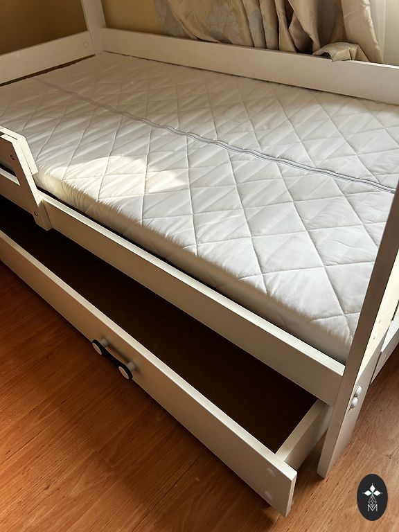 Ļoti forša gultiņa, kalpoja kā rezerves gulta pie omītes, tāpēc ir mazlietota. Ir apakšā uzglabāšanas kaste. Bortiņš palīdz bērnam neizkrist no gultas, tāpēc ideāli piemērota pāriešanai no redeļu gultiņas. Matracis bildē nāca pamatkomplektā ar gultu. Svarīgi! Gultu nevar iznest caur durvīm, tāpēc pašiem būtu to jāatskrūvē, lai zinātu kā to pēc tam saskrūvēt. Pieejama vēl viena tāda pati gultiņa baltā krāsā. Ņemot abas kopā 250€ par abām. Atrodas: Brīvkalni, Mārupes novads