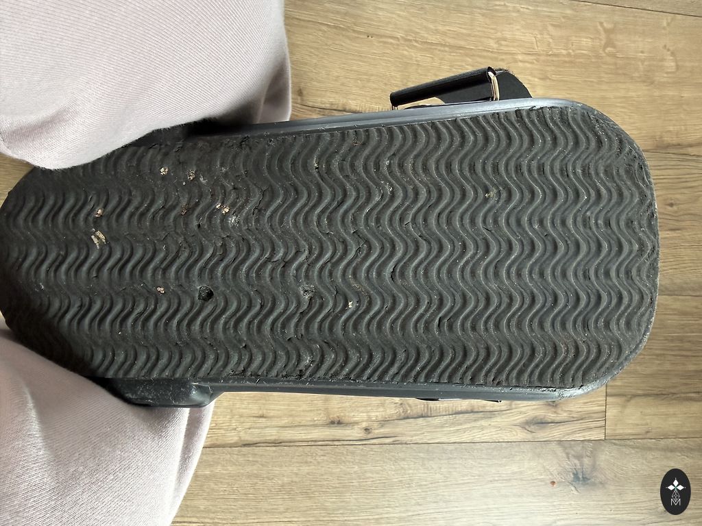 Gently used, however, there are signs of wear. The tag says size 40, but it will fit a size 39 foot.
