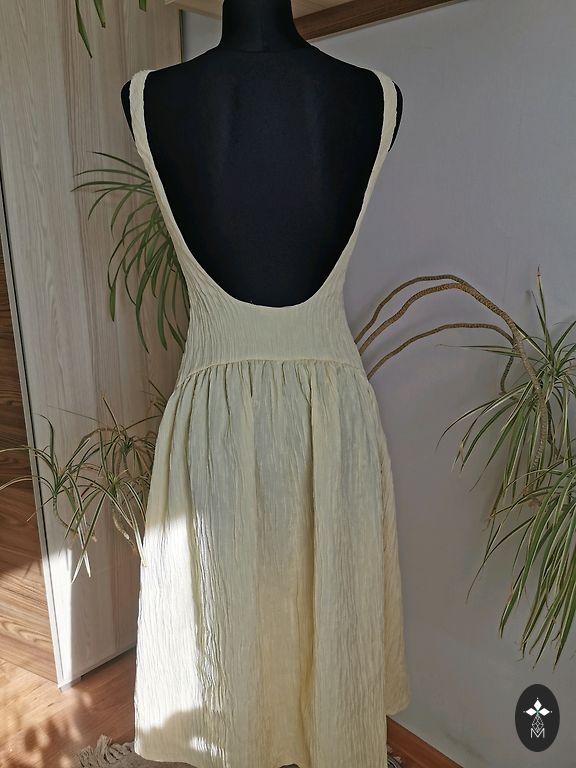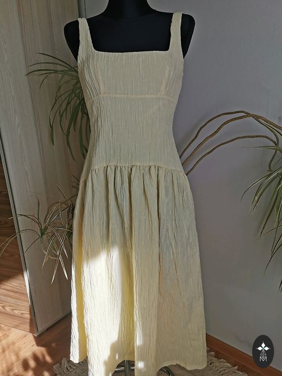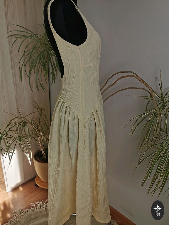 Stils: Midi garums, elegants V-veida kakla izgriezums, viegli caurspīdīgas piedurknes ar dekoratīvām apvilktām podziņām.