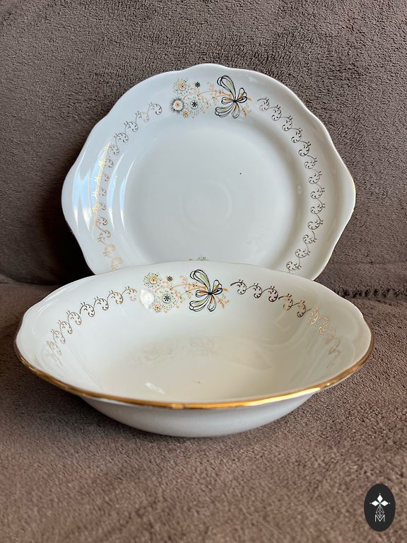Jessen porceliano lėkštės. XX a. pradžia. Užkandžių lėkštė 36x24 cm. Apvali lėkštė - skersmuo 24,5 cm. Be defektų. Minimalūs naudojimo požymiai. Žr. foto. Kaina už abi kartu.