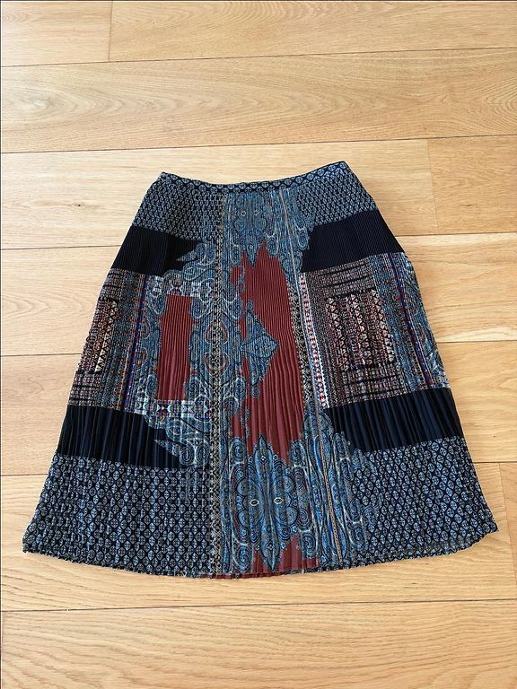Naujas sijonas su etikete. Išsiuvinėtas įdomus piešinys, yra pamušalas, kišenės. Liemuo =/- 2*44 -45 cm, klubai - =/-2852-52, ilgis 62 cm.
