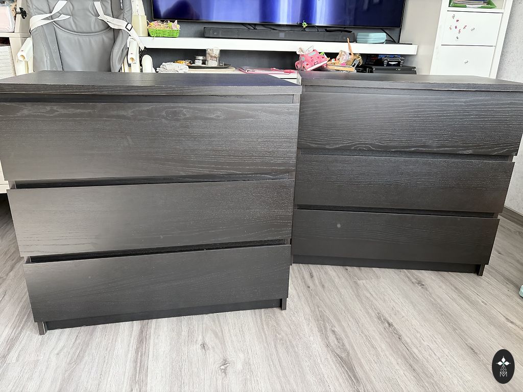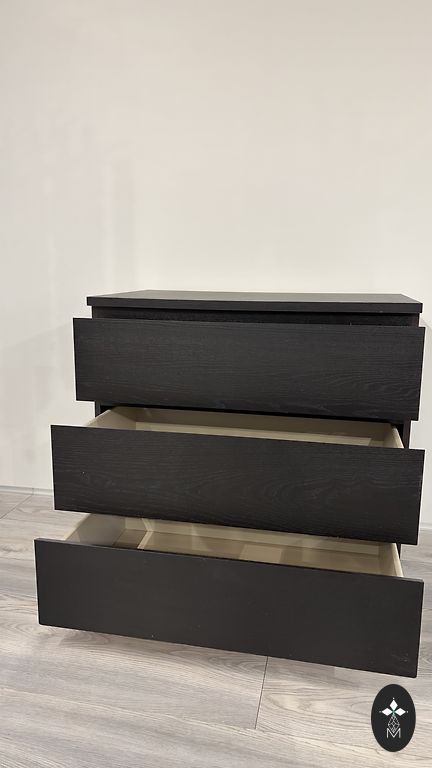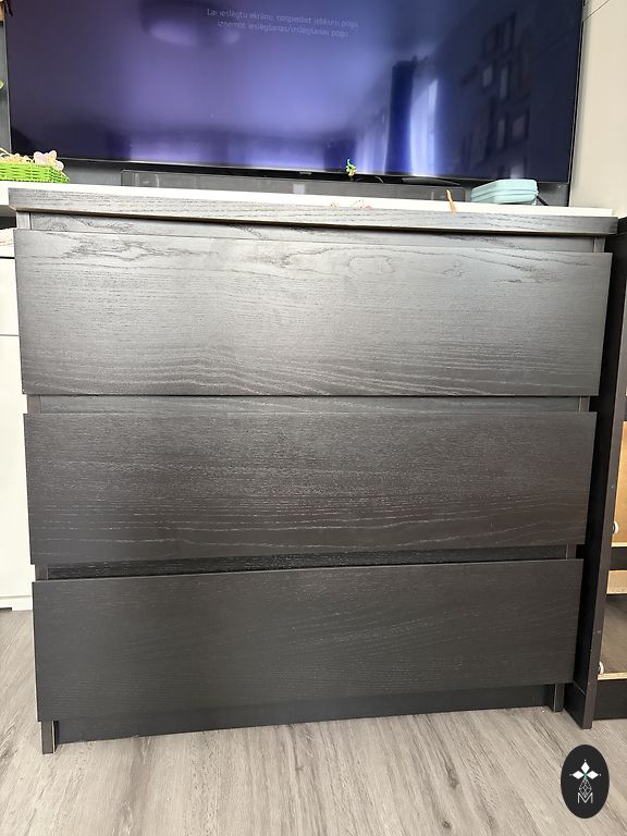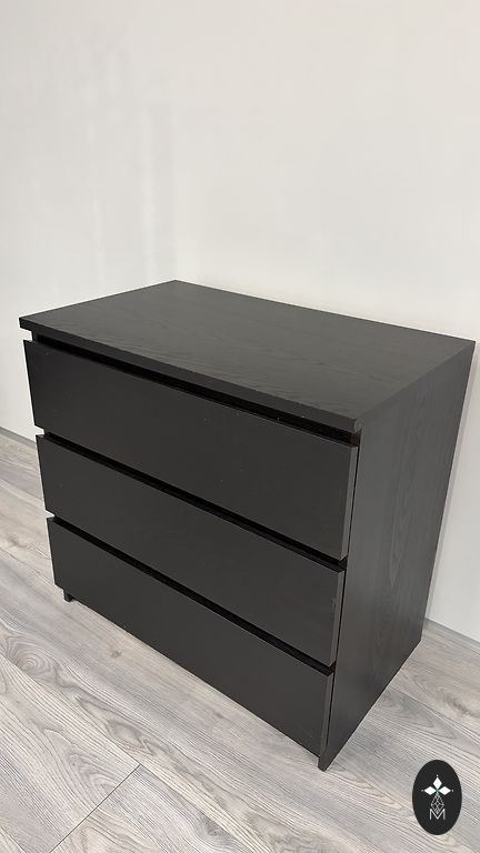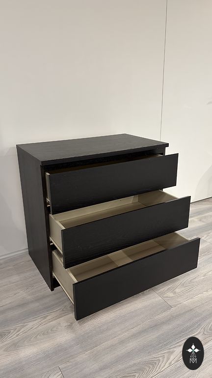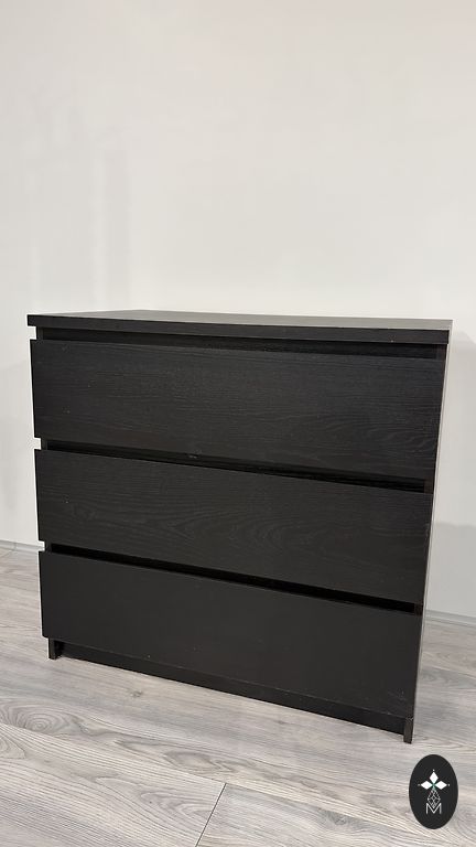 Tamsiai rudos spalvos komoda su 3 stalčiais, labai geros būklės.