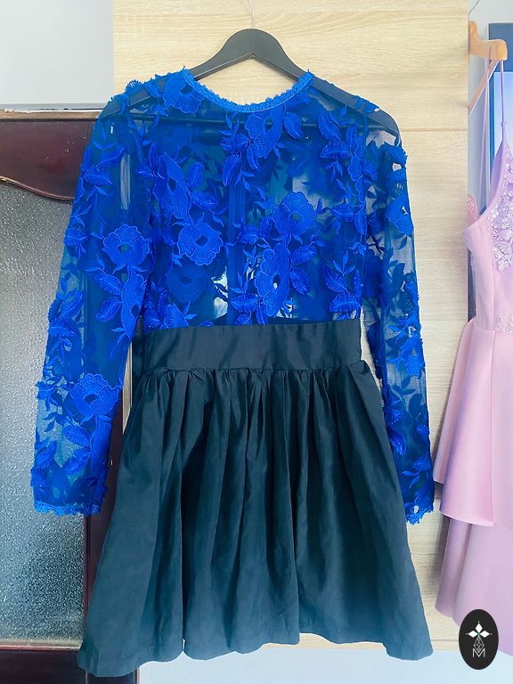 Kleita apvieno klasisku augšdaļu koši sarkanā krāsā (žaketes/vēstes forma) ar vieglu, kuplu, gaisīgu tilla svārku daļu nedaudz tumšākā krāsā, kas piešķir romantisku un nedaudz “princeses” efektu. Vidukļa daļā piegriezums izceļ figūru un veido elegantu siluetu.