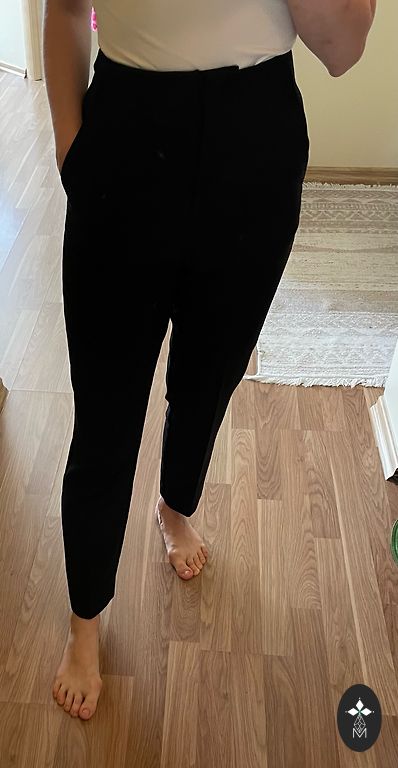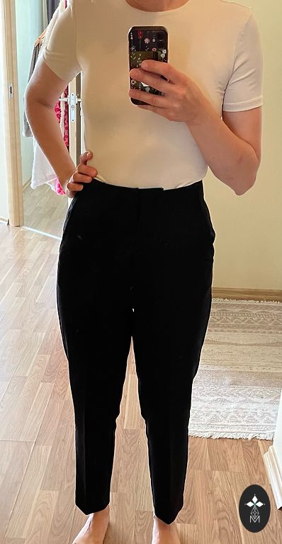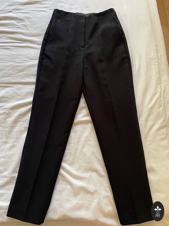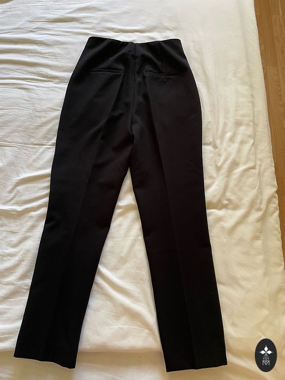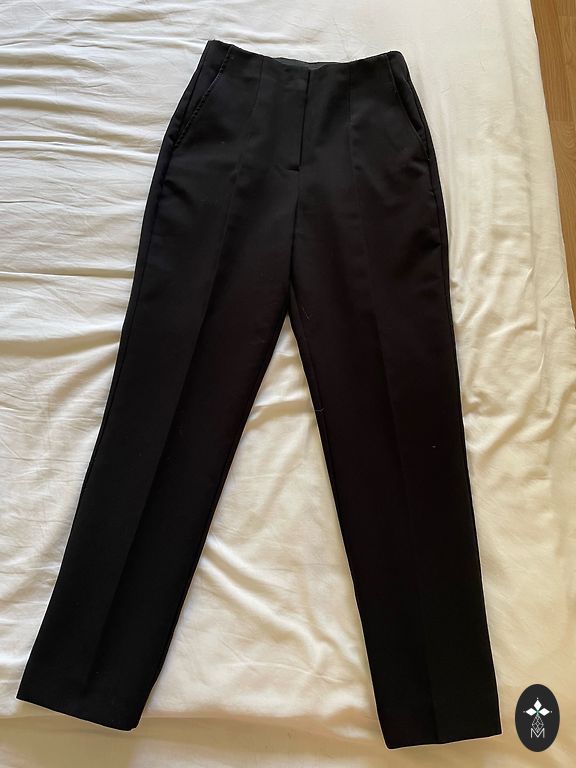 Worn a few times. Firm fabric. At the top, tied like sports pants, on the rubber. Side pockets. High waist, but can be worn as you like. Straight cut.