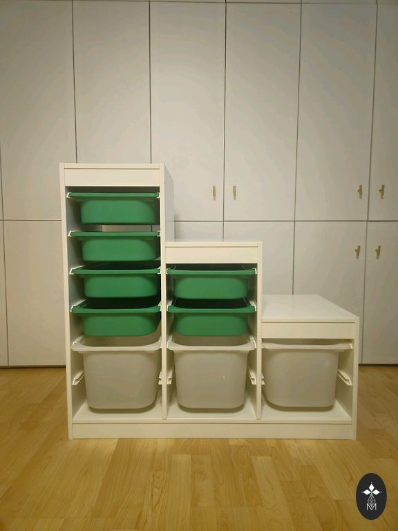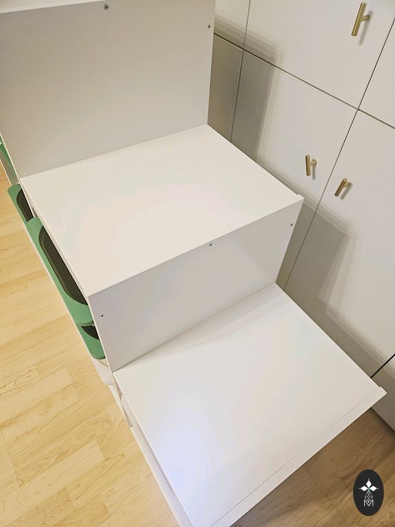 Puikiai tinka mažam kambariui. Daug spintelių, lentynų 90cm gylio, prireikus įstumiamas, išstumiamas stalas.