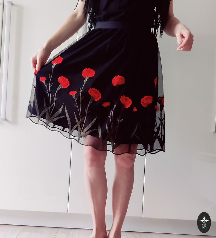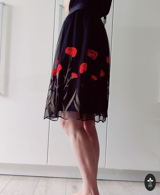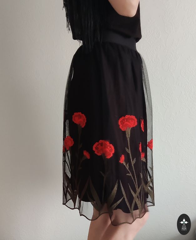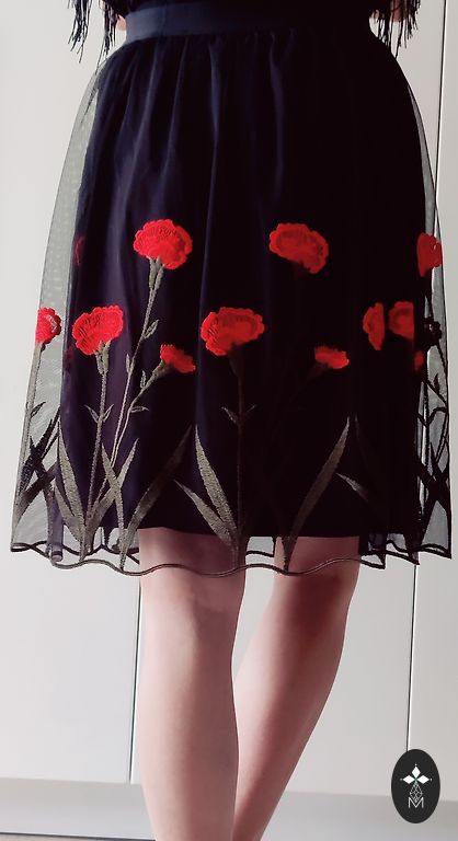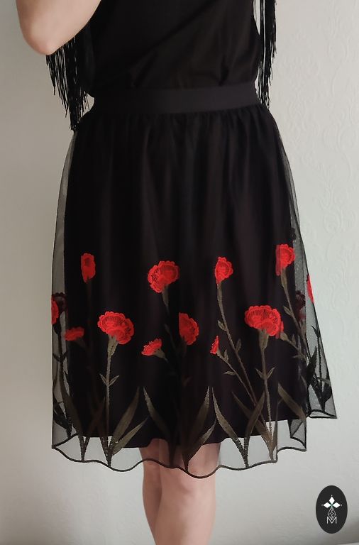 Raudonas sijonas su rožiniu siuvinėjimu. EU 34. Užtrauktukas nugaroje. Be defektų.