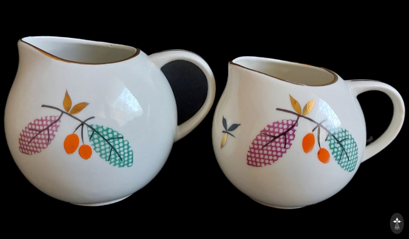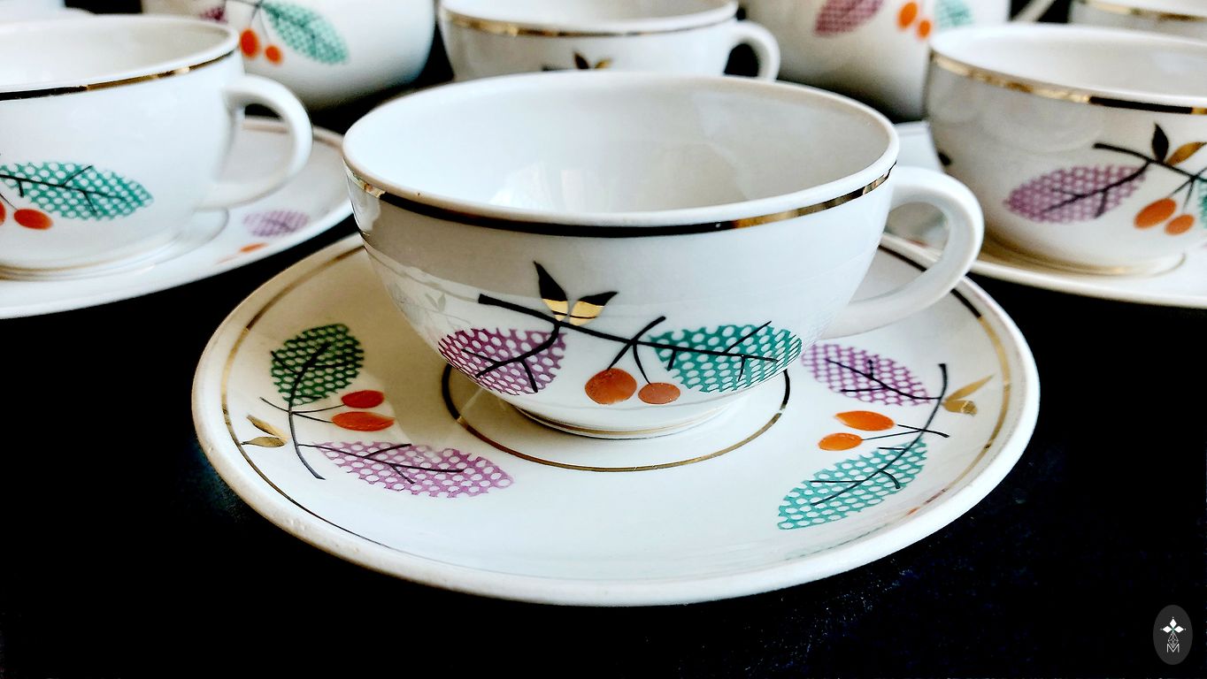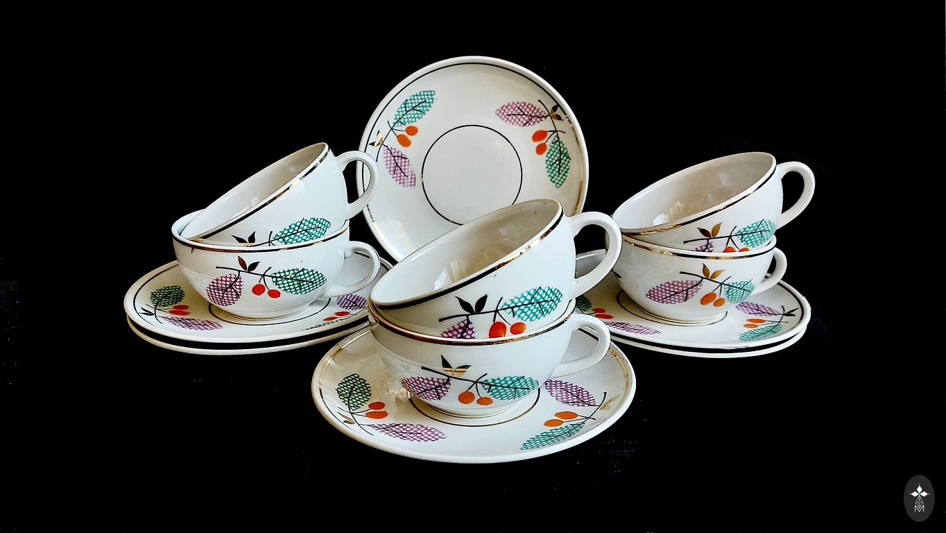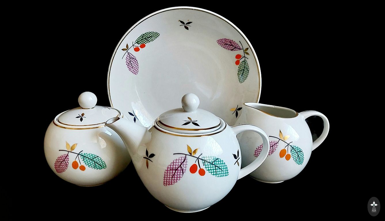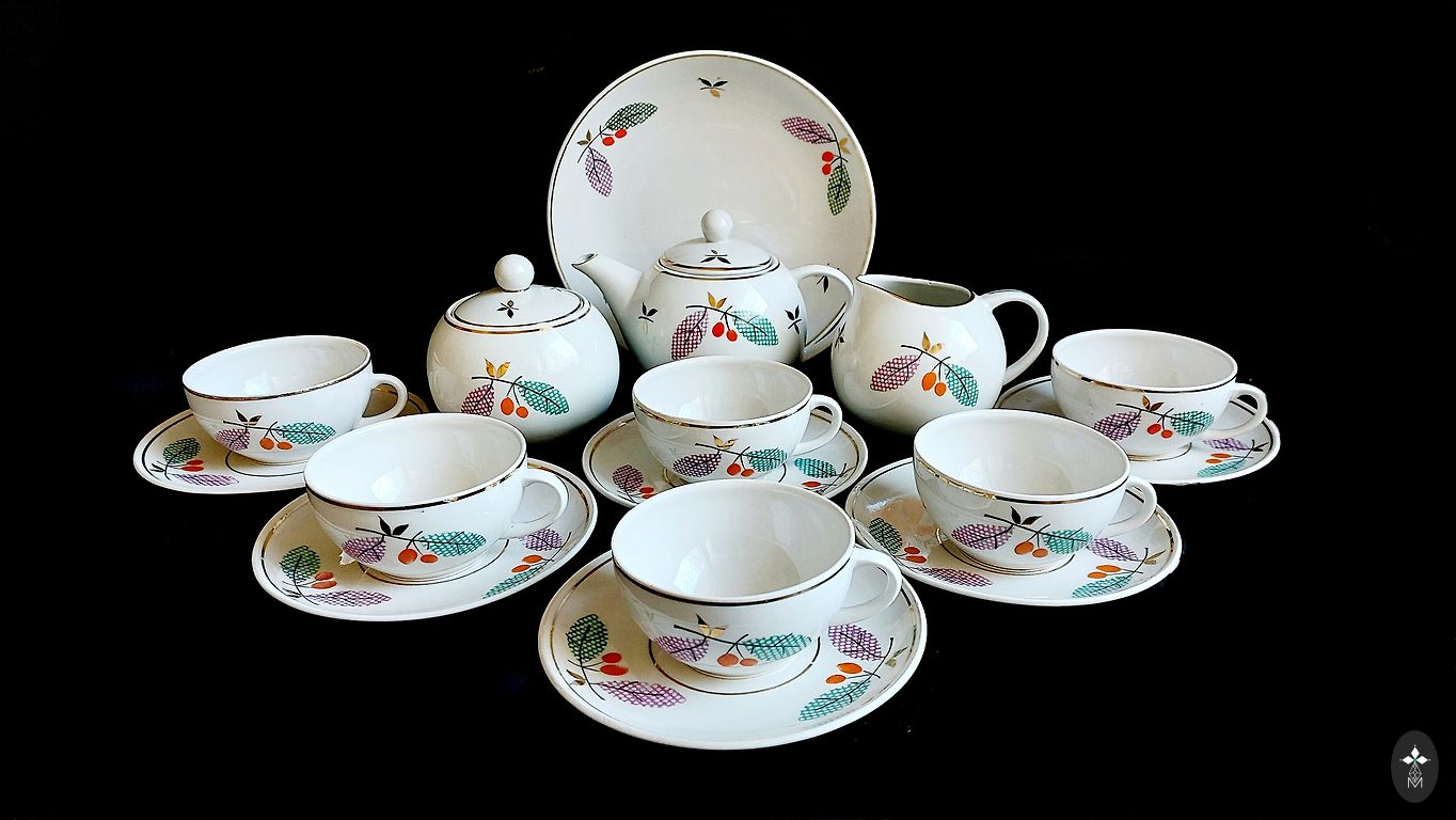 Ļoti labā stāvoklī,bez izteiktām lietošanas pazīmēm, tik cepumu traukam uz stūriem neliels apzeltījuma trūkums...Zilganas tonis