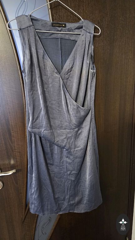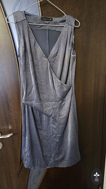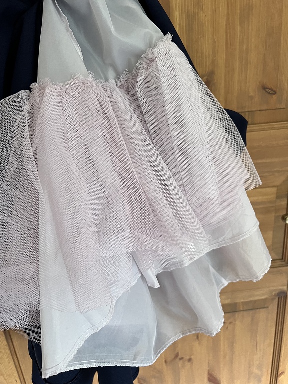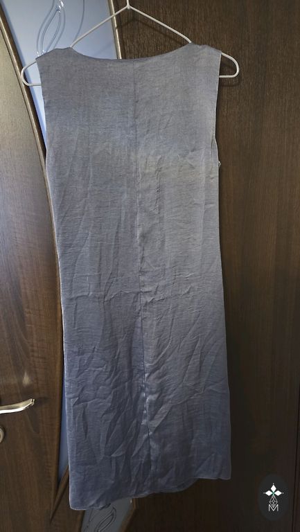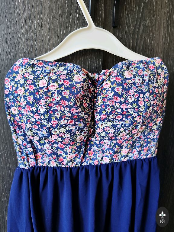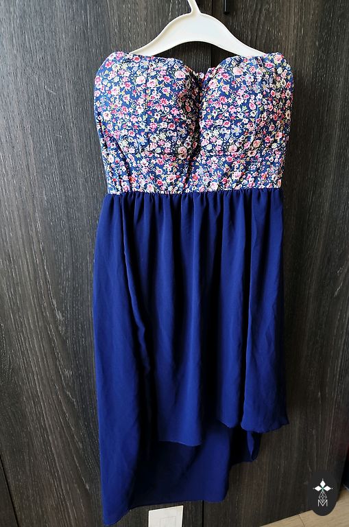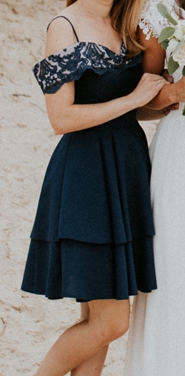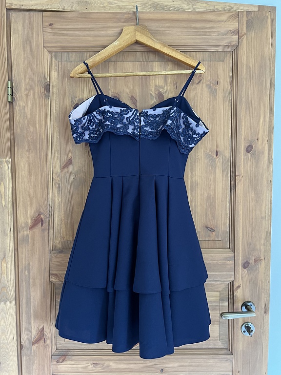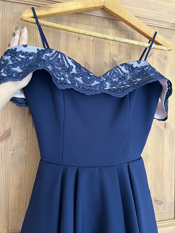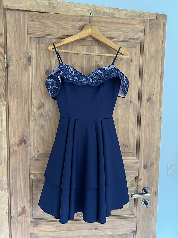 Klasiška suknelė tamsiai mėlynos spalvos su blizgučiais. Rankovės nėriniuotos.