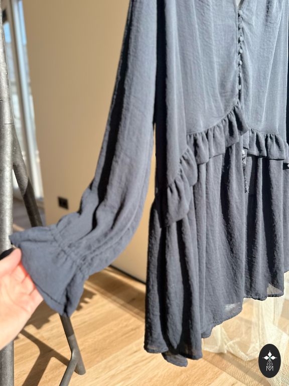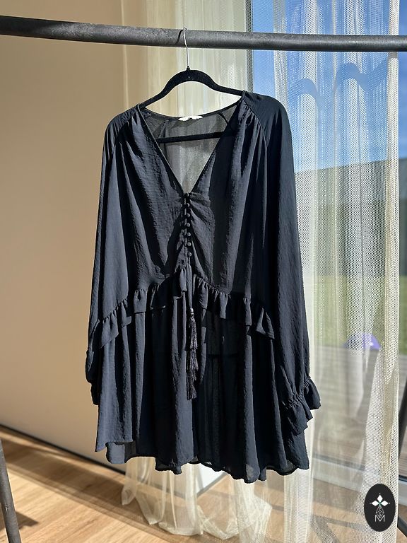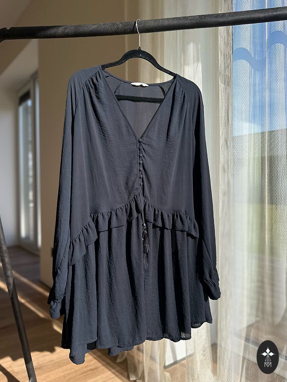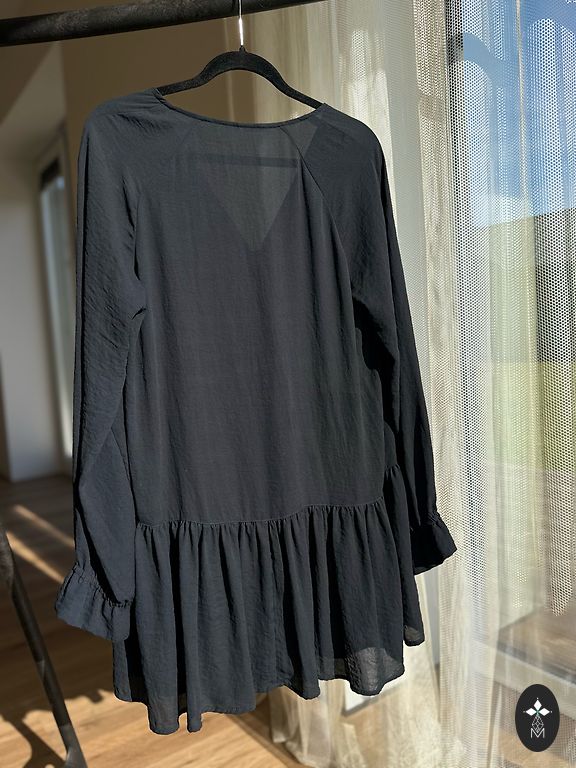 Lai gan norādīts L/XL izmērs, teikšu, ka tas atbilst M izmēram. Kleitas rokas var likt uz pleciem vai nost no pleciem. Defektu nav :)
