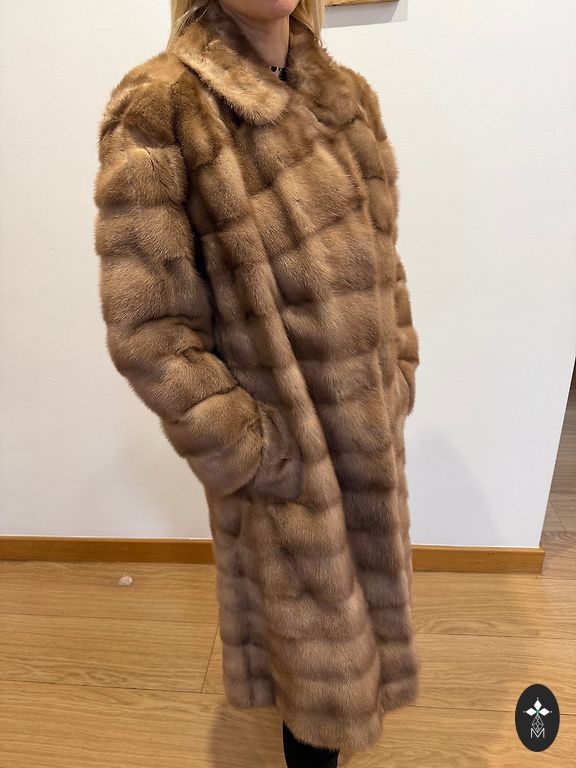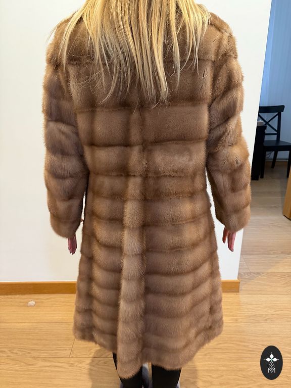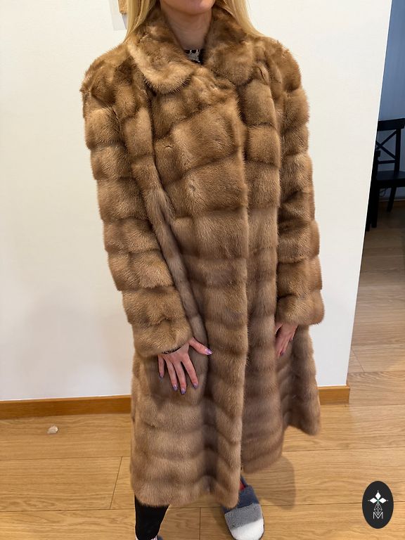 Long and rich mink (American mink) fur coat, worn only a couple of times. Lining with luxurious embroidery. Falls beautifully on the body - perfect fit. Length from collar to bottom - 122 cm, sleeve length from armpit - 46 cm, from armpit to armpit - 54 cm. Expensively bought, selling because it's too large for my mom.