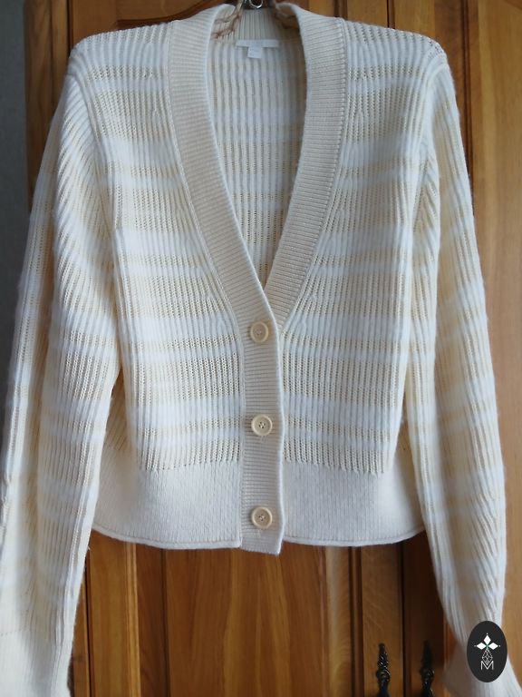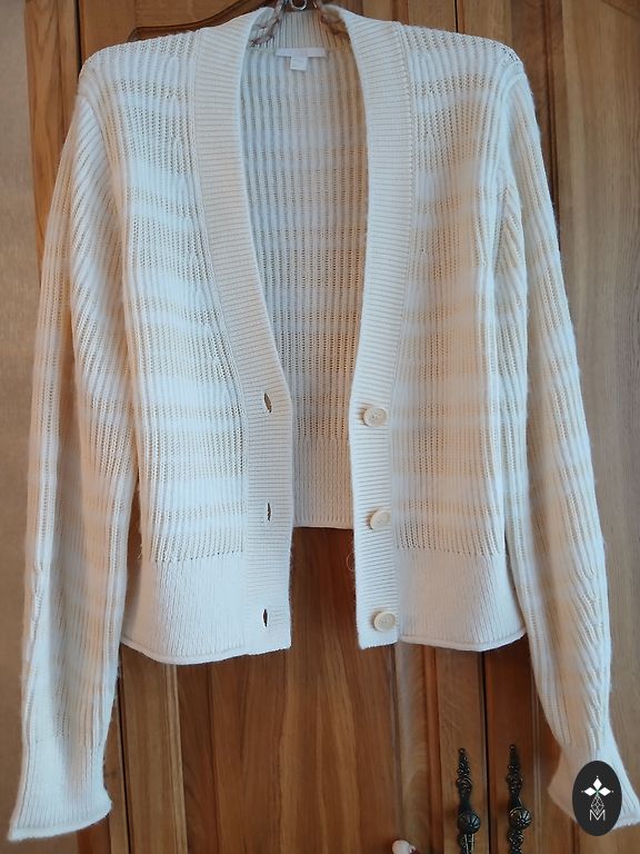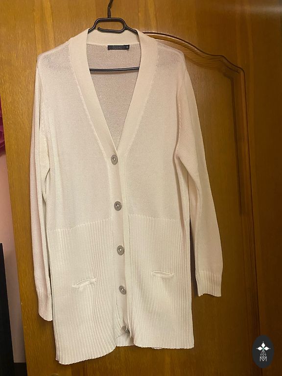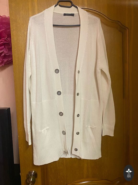 Ilgas TH kardiganas. Pečiai – 45 cm, krūtinė iki 60 cm, ilgis – 122 cm, rankovės – 50 cm.
