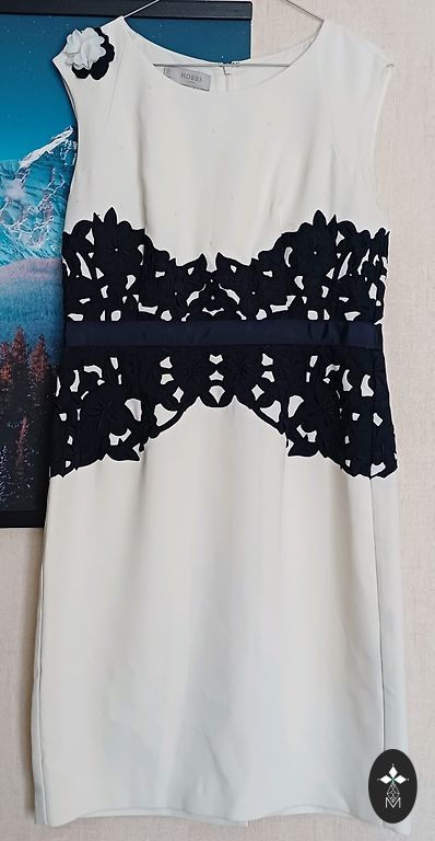 Graži šventinė suknelė, dėvėta tik kelias valandas, puikios būklės, tinka M\L, L dydžiui. Suknelės ilgis 98 cm, krūtinės apimtis 95 cm. Spalva balta ir rugiagėlių mėlyna.