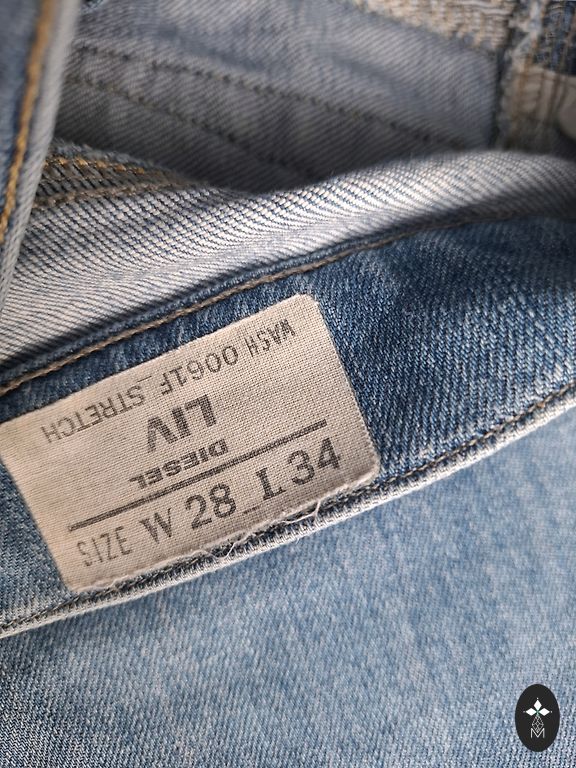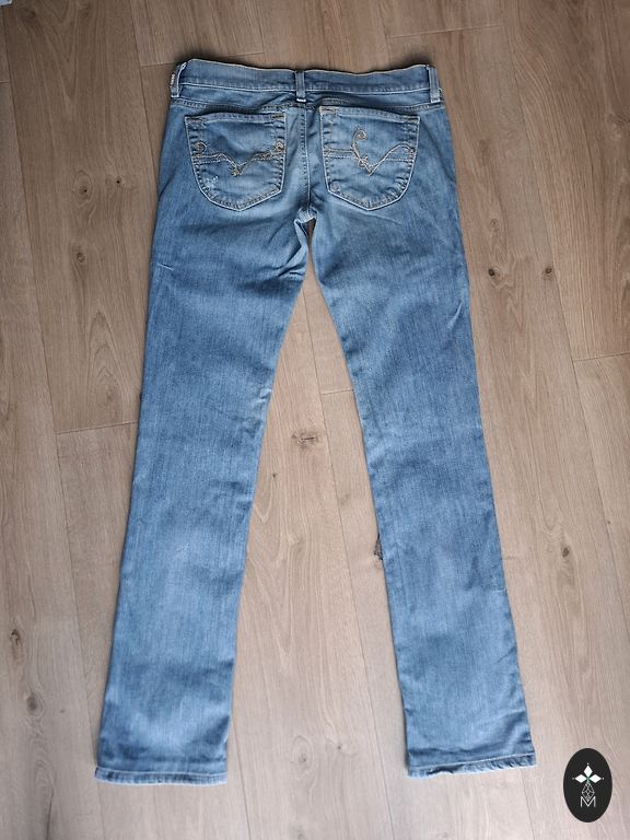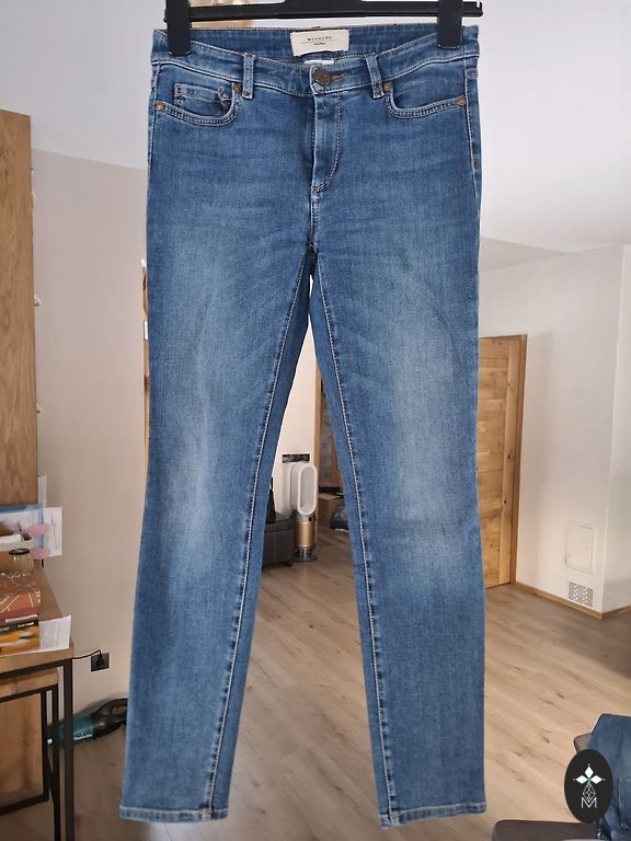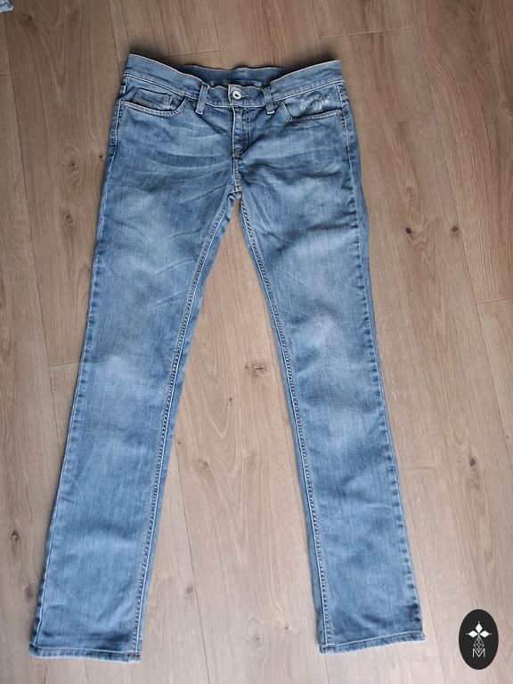 Siaurios kelnės, panašios į džinsus, bet patogesnės – 98 % medvilnės ir 2 % elastano. Nurodytas dydis: 26. Kelnių ilgis, matuojant nuo išorinio krašto: 99 cm, juosmens plotis: 36 cm.