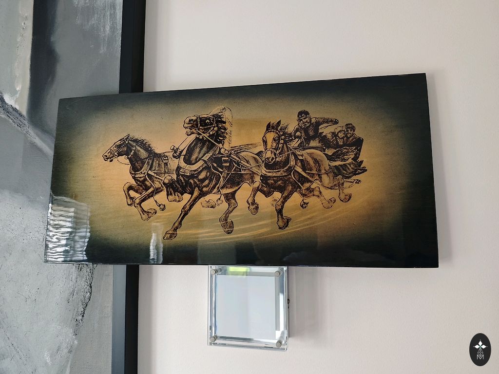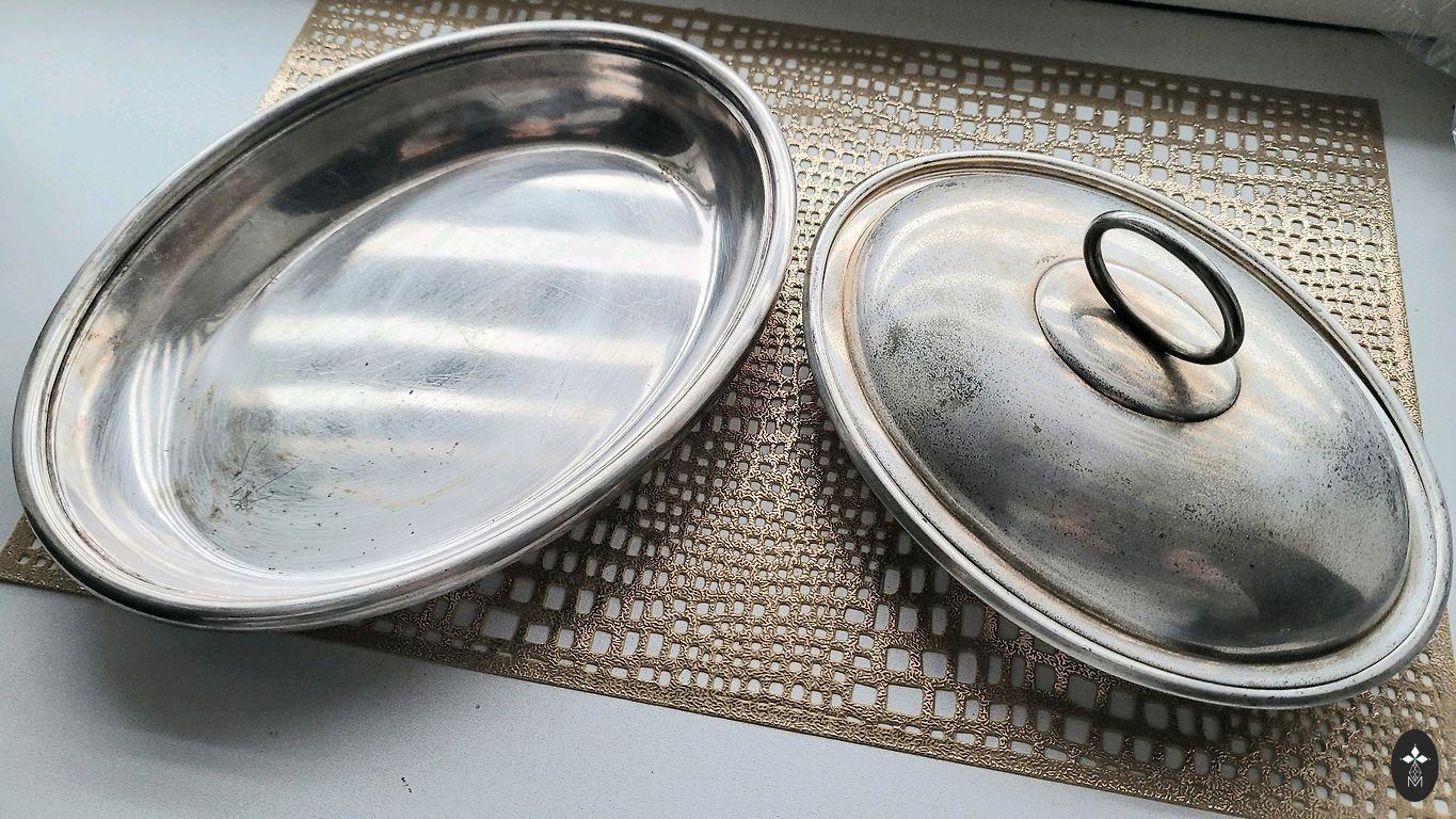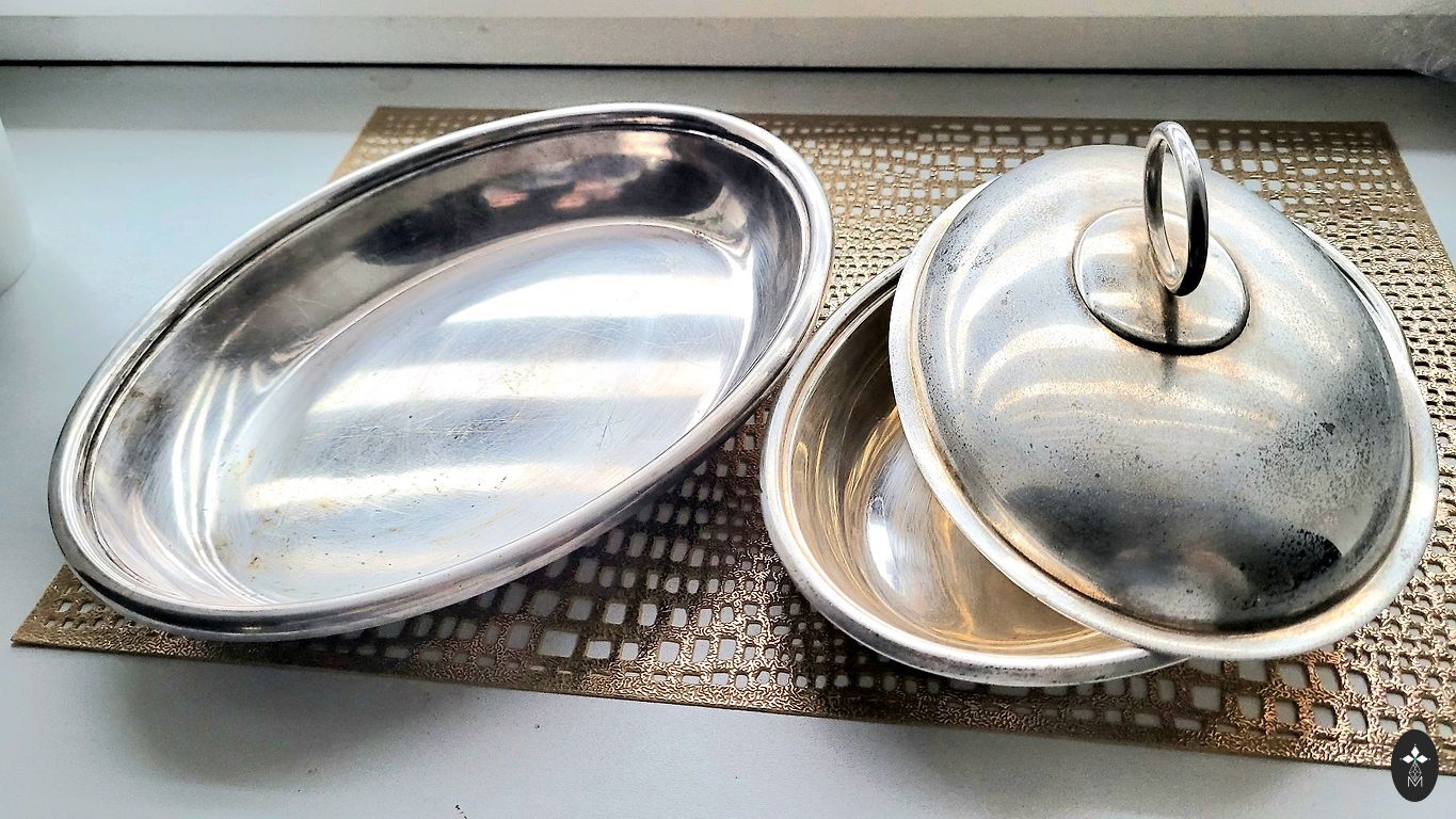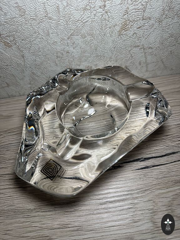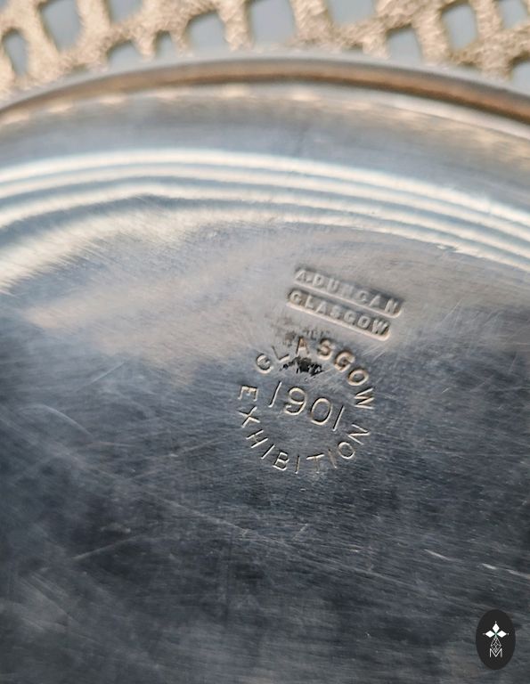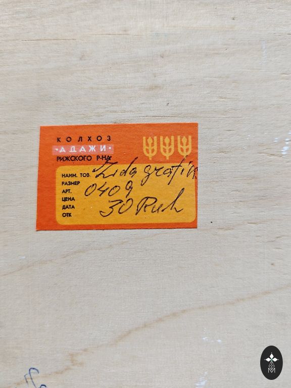 Izgatavots no 875. provē sudraba, iekšējā virsma pārklāta ar zeltījumu un ir marķēta ar šādiem zīmogiem: taisnstūra formas plāksnīte ar strādnieka galvu un skaitlisko apzīmējumu 875. provē sudrabs, burts "М" - Maskavas provēšanas uzraudzības inspekcijas kods, blakus atrodas ražotāja zīmogs taisnstūra formā ar apzīmējumu "AMYU4" - artelis "Maskavas juvelieris", ražošanas laiks - 1954. gads. Lieliskā stāvoklī. Izmēri: 10,7 x 8,3 cm.