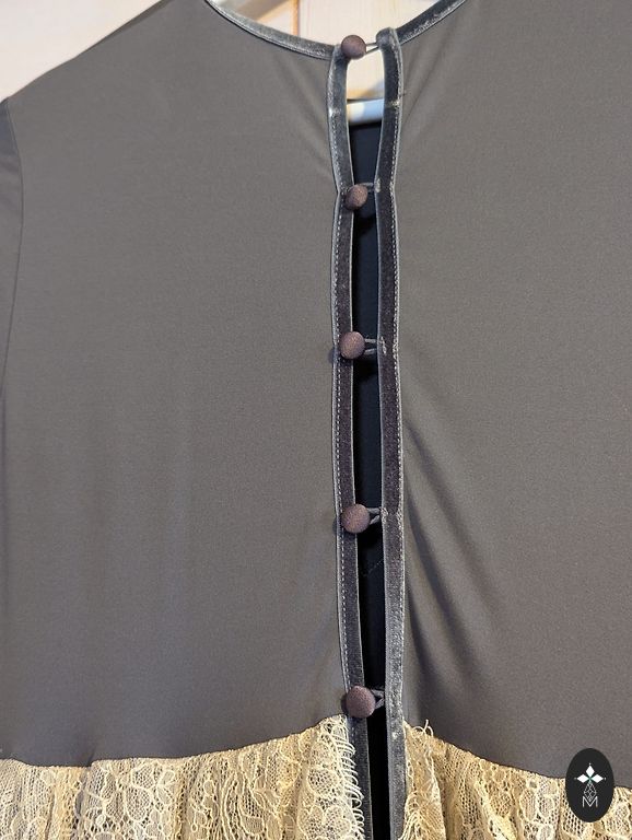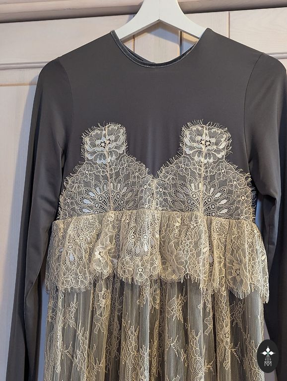 Skaista kleita ar mežģīņu apdari- svētku noskaņai. Vilkta 1x uz koncertu. Kabatas sānu šuvē. Jostu var nēsāt dažādos veidos, arī bez jostas ērti un labi. No paduses lîdz padusei 50 cm, gurnos 52 cm, pleci, neskaitot kuplàs piedurknes -37 cm no vienas šuves lîdz otrai. Garums 133 cm.