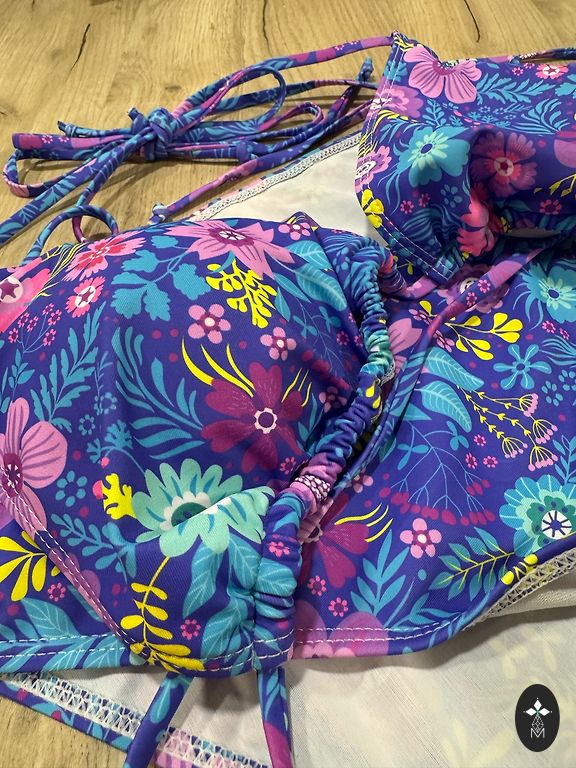 Labai įdomus, moteriškas maudymosi kostiumėlis su dekoratyvinėmis sagomis, užtrauktuku ir subtiliais raukiniais. Raudonas su juodais, tarsi gėlių raštais. Petnešos reguliuojamos. Krūtinėje nedidelis paminkštinimas. Tiks B dydžio krūtinei. Neištemptas krūtinės apimtis 40x2 cm, ištemptas iki 55x2 cm.