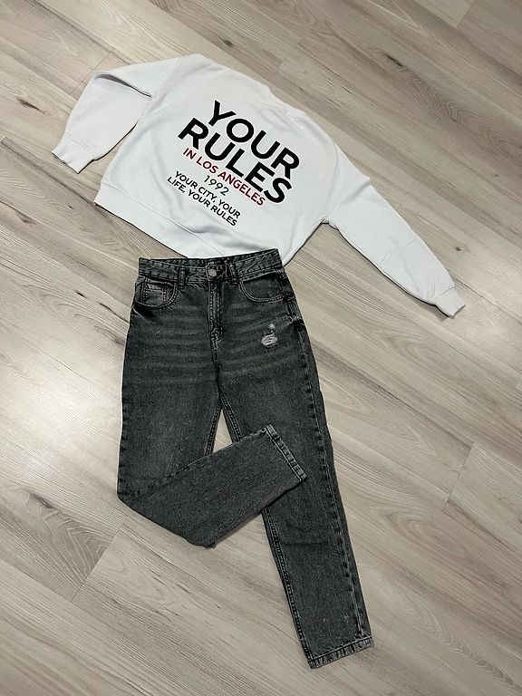 Selling a soft, high-quality grey knit set. Sweater size 38, but also fits M and small L, pockets in khaki color, which are not just for decoration. Pants with widened ends and flap. Also size 38 and never worn. Bottom leg width 27x2, outer seam 104, inner seam 74. High waist.