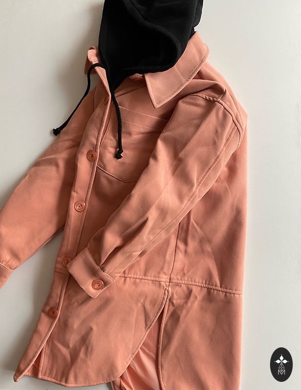 Trench coat — brick red, A-line cut, extended, dense fabric. With a hood. Suitable for 1.75 m, size 42-44. Can be worn with a belt. Unlined.