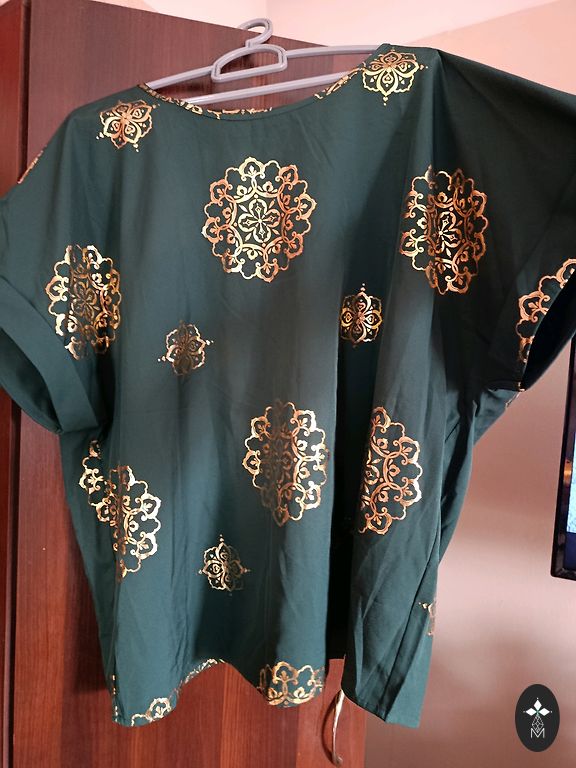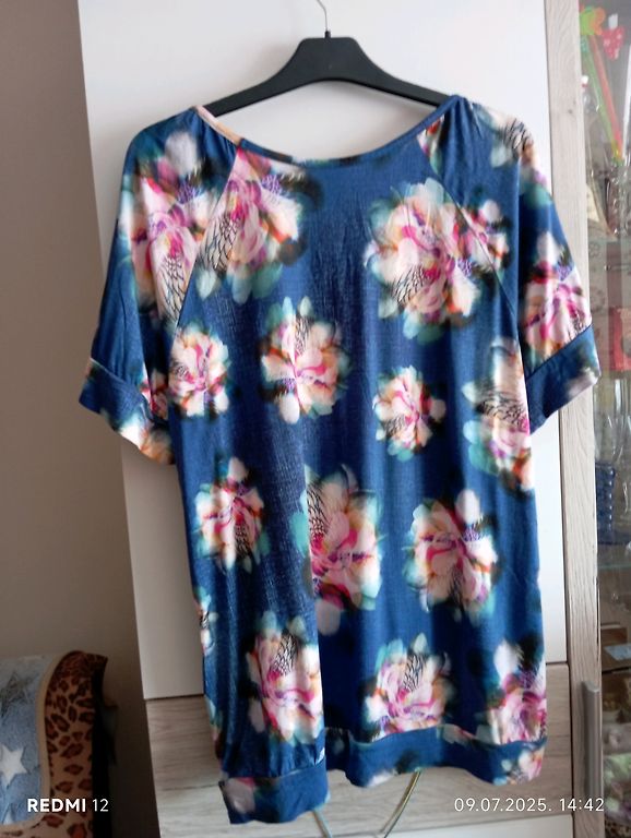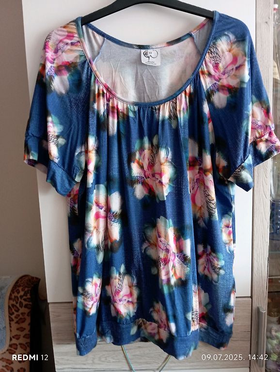 Lengvo audinio palaidinė su trumpomis pūstomis rankovėmis, krūtinės apimtis 68, po krūtine 60, ištempus 68, nes nugaroje yra guma. Ilgis 73 cm.