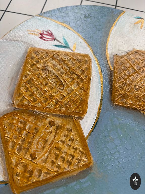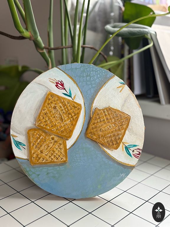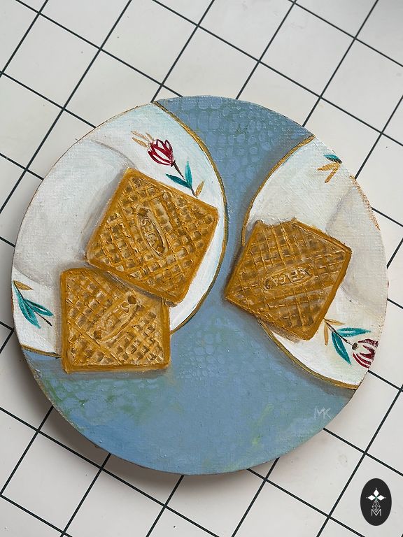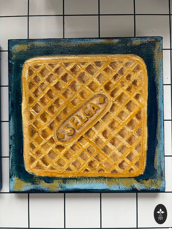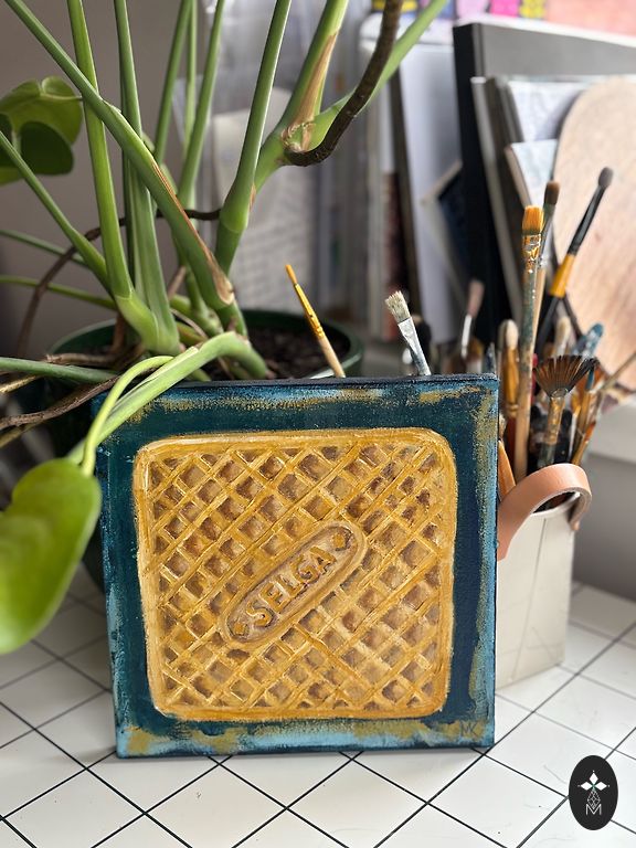 Elļa lõuendil, 30x30 cm; abstraktne sürrealistlik maastik (poolabstraktne/poolrealistlik stiil), maalitud looduslike mulla- ja mineraalpigmentide ning linaseemneõliga – omatehtud õlivärvidega, mis ei sisalda mürgiseid ega kunstlikke lisaaineid.