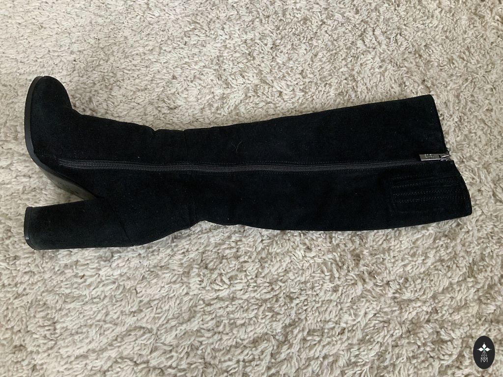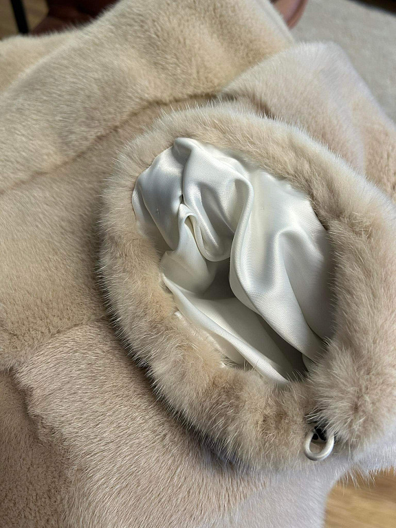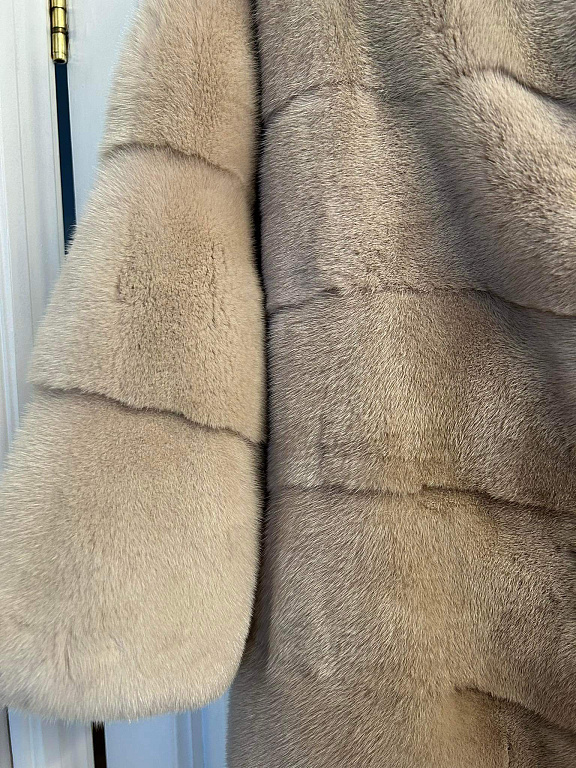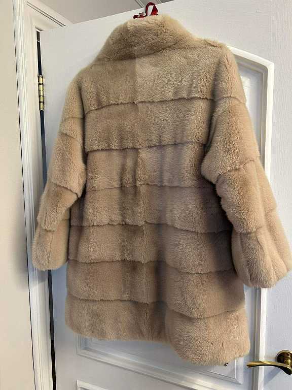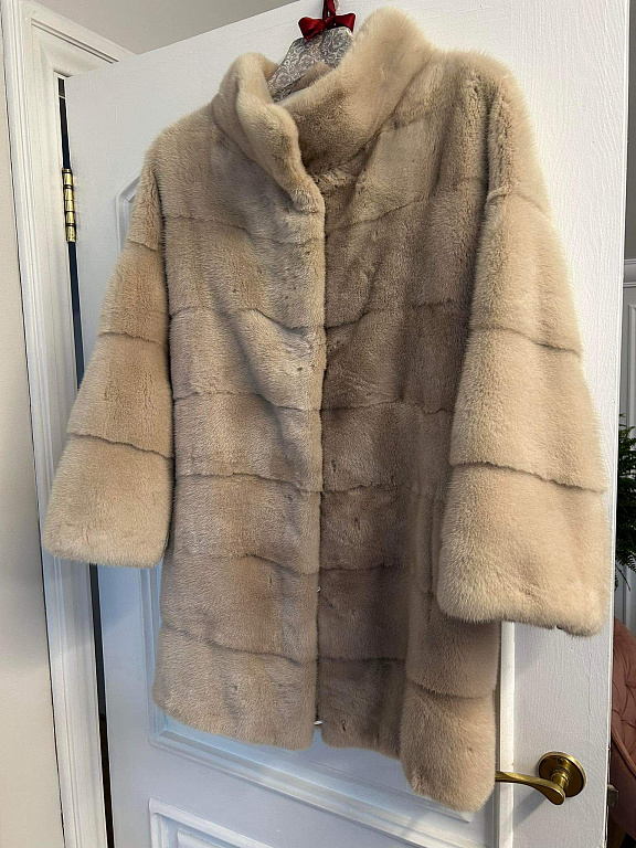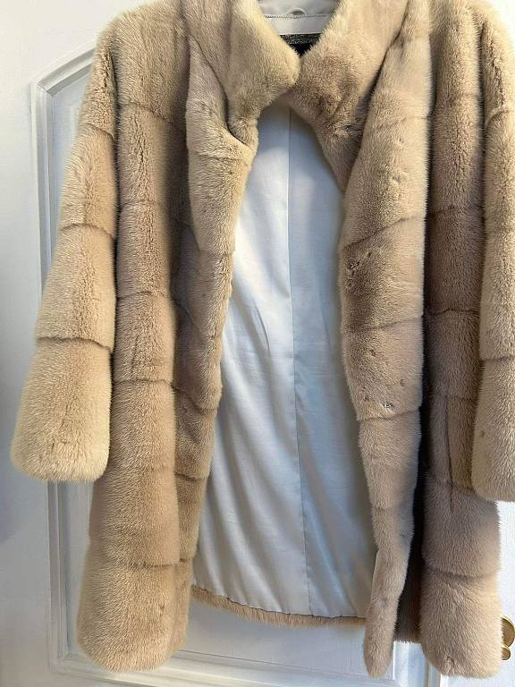 Dūmakaini pelēkzilā krāsā, viegls, bet silts, jo sastāvā 55% lana un 45%vilna, dabīgās kažokādas apkaklīte ( noņemama). Mēteļa garums 100 cm, krūtīs max 100 cm, piedurkņu garums no pleca 65 cm.