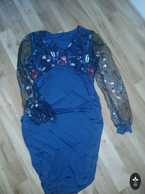 Worn once for a formal dinner. Very comfortable, pleasant against the body. Flexible, so it fits the figure beautifully. With sewn and glued golden beads and stones. Fastened with a zipper at the back. Size M.