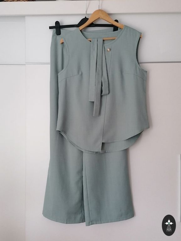 Augšiņa: Moderns piegriezums ar īsām piedurknēm. Aizmugurē iestrādāts diskrēts rāvējslēdzējs ērtai uzvilkšanai. Īpašs akcents – stilīgs šķēlums žaketes aizmugurē, kas piešķir koptēlam vieglumu.