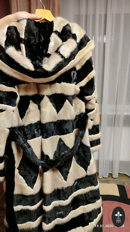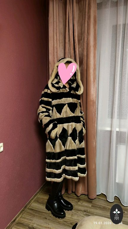 Цельные шкурки , плотный пушистый мех, боковые карманы, длина шубы 110см.