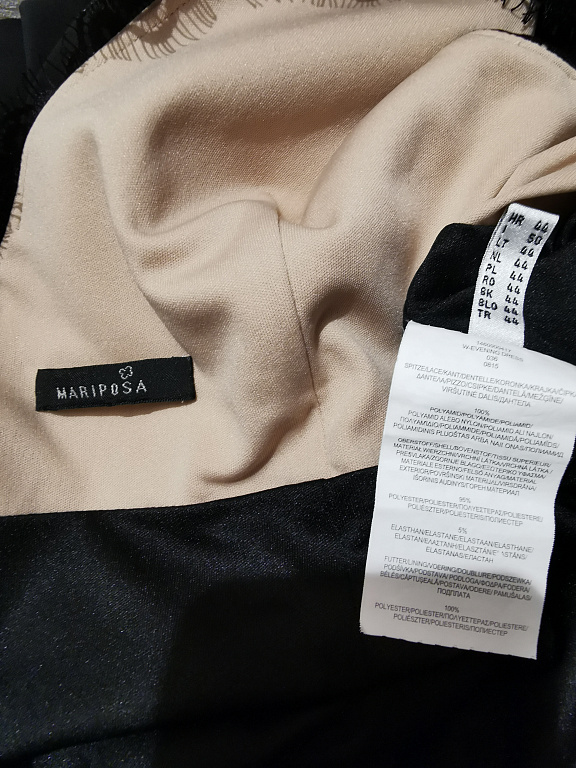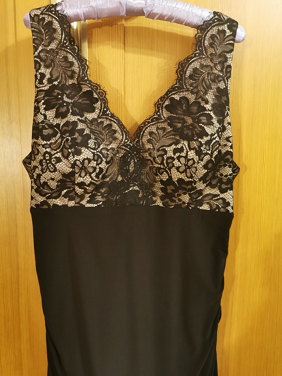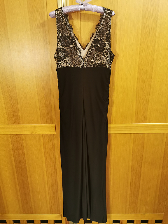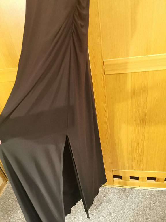 A flattering evening dress. Ruching at the front and back of the dress covers possible figure imperfections. The bust area of the dress is fitted with padding and a silicone band for a good fit. The dress has a lining throughout its length. The dress is stretchy. Worn once.