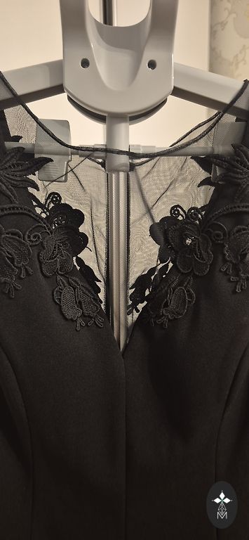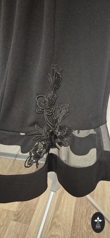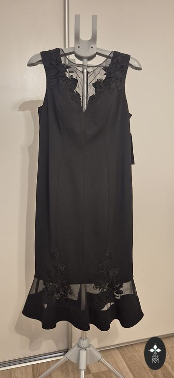 Eleganta grezna melna kleita ar zelta krāsas fliteriem. Uz birkas -XL. Perfekti atbilst 12.-14.izm. Kleitas iekšpusē melna trikotāžas oderīte, 3/4 piedurkne. Perfekti izskatās uz auguma. Kleitas garums 96cm.Krūtīs 100cm,gurnos-104cm.