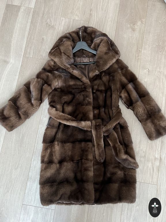 Шуба из норки красивого благородного цвета - шоколад. С капюшоном, на поясе, талия регулируется, рукава стянуты резинкой. Длина - 102 см. Без дефектов.