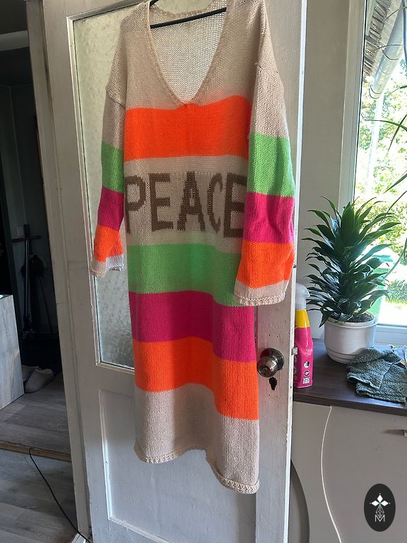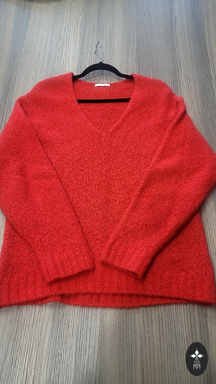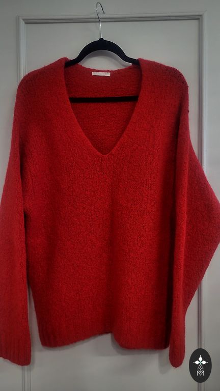 Labai gražus megztinis, tinka L/XL dydžiui. Apačioje yra nedidelė dėmė, kuri visiškai nematoma (4-oje nuotraukoje), ir užtrauktukas su filtru, kurį galima įtraukti į vidų (paskutinėje nuotraukoje). Senovinės rožės spalvos.