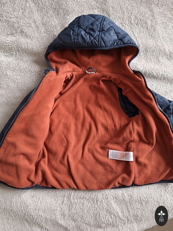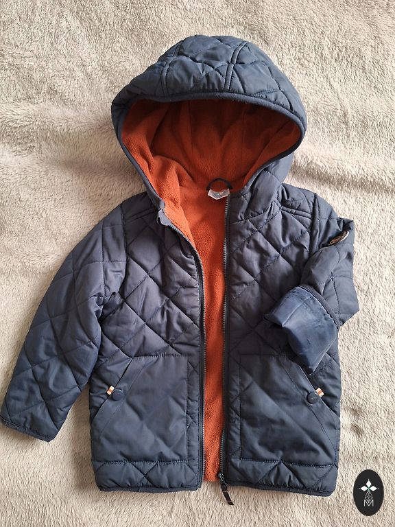 Очень классная и теплая зимняя куртка размера 98, с теплой/пушистой подкладкой (см. фото). Без дефектов.