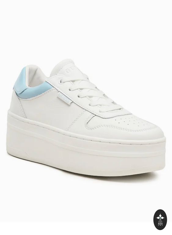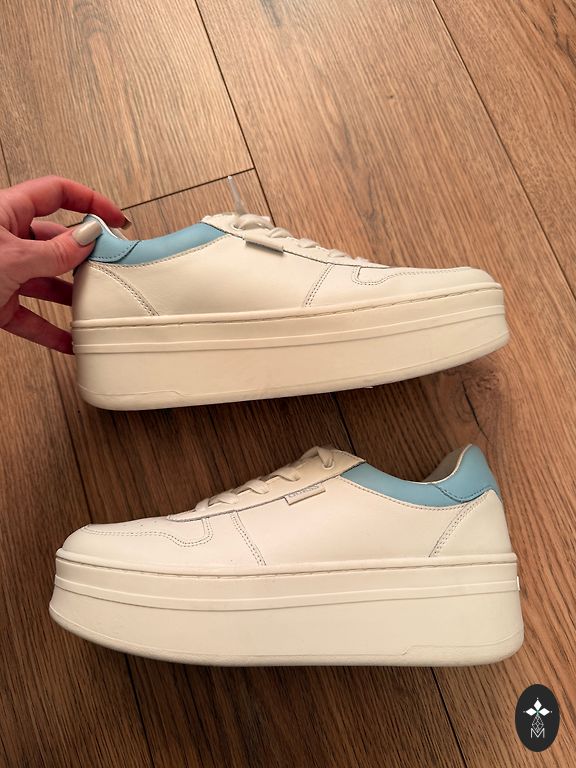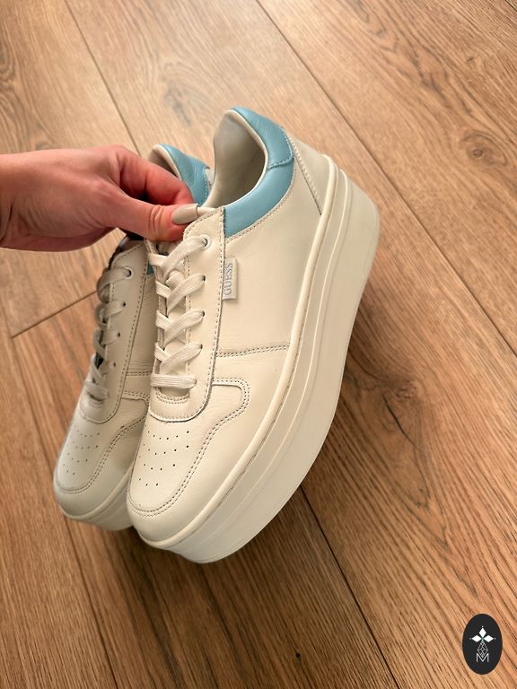 • Dizains: spilgts un drosmīgs — balta āda ar firmas apdruku, kas apvieno ziedus un plēsēju. Metāla furnitūra ar logotipiem uz mēles un šņorēm izceļ premium kvalitāti.