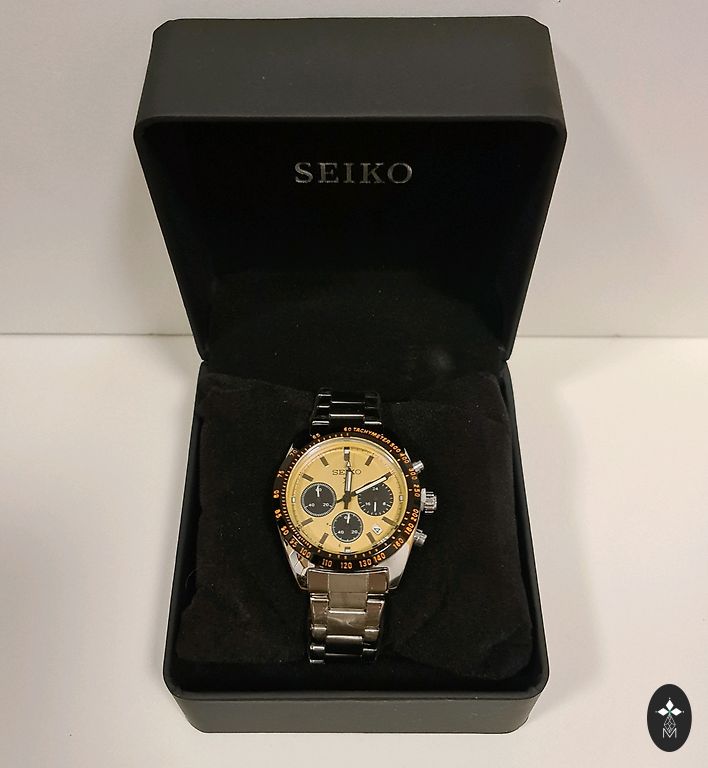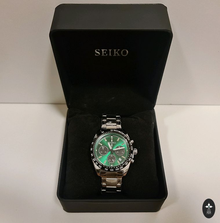 Pulkstenis ir ar Zeltītu/Sudrabotu metāla siksniņu un skaisti apvienoti zeltaini un zaļi toņi uz pulksteņa korpusa.