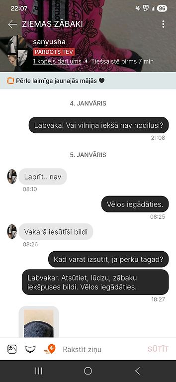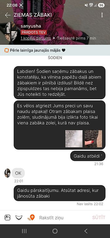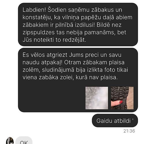 Maldina pircējus par preces kvalitāti un stāvokli. Iegādājos Kuoma zābakus bērnam, vēl pārjautāju, vai vilniņa iekšpusē pie papēža nav nodilusi. Uz ko saņēmu atbildi ka nē. Arī foto tika sūtīti, bet tajos tieši nodilušās vietas nebija manāmas. Kā arī sludinājumā tika ievietota 1 zabāka zoles foto un netika brīdināts, ka otram zābakam zolē ir plaisa. NOSŪTU FOTO gan ar saraksti, gan zābaku stavokli.