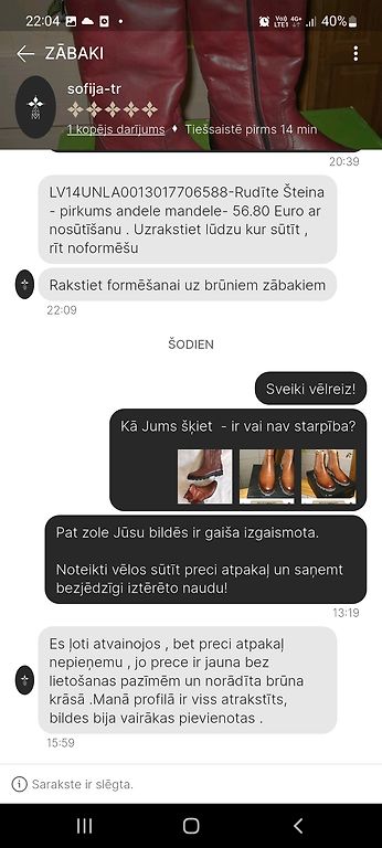 Sveicināti, atbildot uz Jūsu atsauksmi kapēc nevēlos komunicēt ar Jums par pārdoto preci es Jums uzrakstīju - Jūs nopirkāt jaunus ādas kvalitatīvus zābakus , bez jebkādiem trūkumiem brūnā krāsā , piekritāt maniem noteikumiem , profilā tika uzrādīts nopārdoto preci atpakaļ nepieņemu, varbūt Jums ir problēmas ar lasīšanu . Kas attiecas par tīšu krāpniecību apvainojot mani , plānoju uzrakstīt par cieņas un goda aizkaršanu.