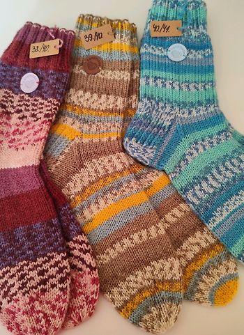 Pašas adītus izstrādājumus,pārsvarā zeķes,kas tiek adīti tikai un vienīgi no veikala dzijas. Adu tikai ar rokām.
